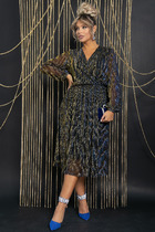 Модель Х-образного силуэта, на подкладе, с отрезной линией талии и втачным поясом. На поясе застрочены складки. Вырез горловины V-образный. Верхняя часть переда со средним швом и драпировкой. В среднем шве спинки обработана потайная застёжка молния. Нижняя часть платья со сборкой по талии. Низ обработан присборенным воланом и декоративной рюшей. В боковые швы по талии вставлен завязывающийся пояс. На рукаве сборка на резину, декорированная рюшей.