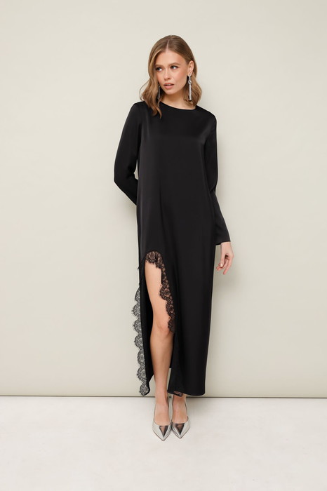 Стильное платье прямого силуэта, выполнено из струящейся ткани с благородным матовым блеском. Округлый вырез горловины. Рукава длинные втачные. Внизу обработан высокий разрез с кружевной отделкой. Застёжка по спинке в среднем шве «капля» на пуговицу и навесную петлю.