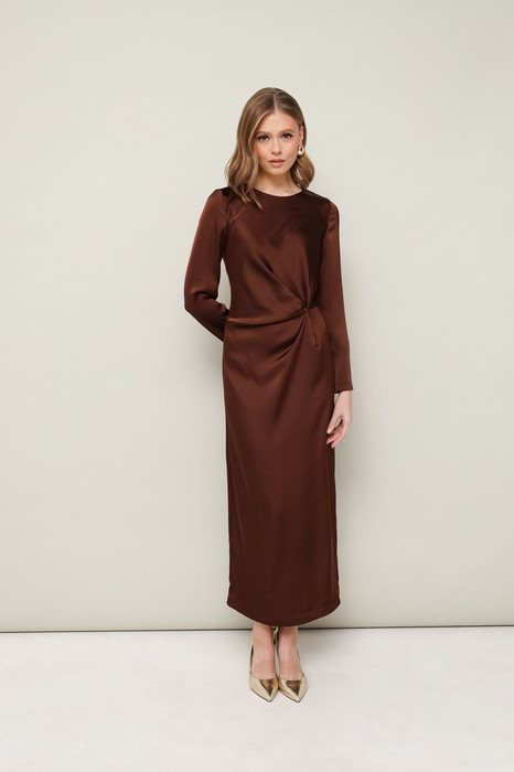 Вечернее платье полуприлегающего силуэта, выполнено из струящейся ткани с благородным матовым блеском. Горловина округлой формы. В области талии заложены складки, плавно переходящие в драпировку. Рукава втачные длинные. Застежка в среднем шве спинки на тесьму молнию. Для удобства движения сзади обработан разрез.