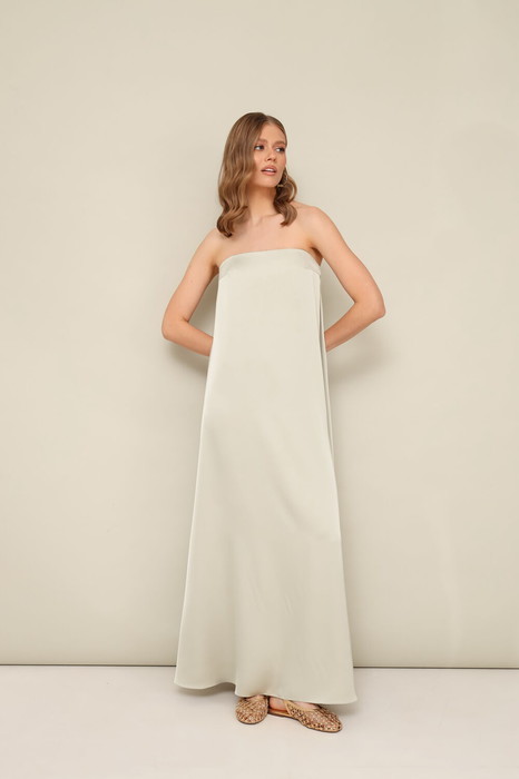 Элегатное А-образное платье в длине макси, выполнено из струящейся ткани с благородным матовым блеском. Лиф с корсетными чашками, по спинке обработана потайная застежка на резинку с крючками, для комфортного прилегания лифа по линии груди. В среднем шве спинки застежка на потайную молнию. В комплекте прилагаются силиконовые бретельки.