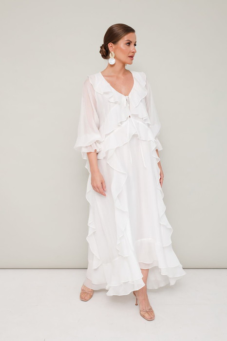 Летящее платье А-силуэта, выполнено из полупрозрачной вискозной ткани. Горловина с V-образным вырезом-каплей с завязками. Лиф переда с подрезами с воланами, переходящими на спинку. Юбка с вертикальными подрезами с воланами. Рукава-реглан с манжетами на резинке. Низ фигурной формы. Платье обработано подкладкой.
