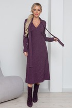 Платье прилегающего силуэта, длиной до середины икры. Платье отрезное по линии талии. Лиф платья выполнен в виде корсета со шнуровкой по спинке. Юбка спинки с талиевыми вытачками и средним швом, в котором обработана застежка на потайную тесьму-«молнию». Юбка переда выполнена на запах с ассиметричным разрезом. Платье с объемным декором в области груди, рук и спинки.
