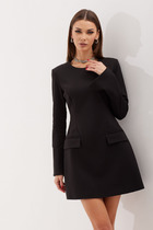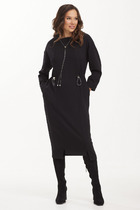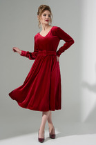 Платье полуприлегающего силуэта, выполненное на запах, длиной до середины бедра. Платье отрезное по линии талии. Лиф спинки со средним швом и рельефами. Лиф переда с рельефами от пройм до подреза по талии. Юбка спинки со средним швом и талиевыми вытачками. Юбка переда ассиметричная: правый перед укорочен, левый перед удлинен. Воротник пиджачного типа. Рукава двушовные, втачные, длиной до локтя. Застежка по переду на петли и пуговицы. Платье на подкладке с плечевыми накладками.