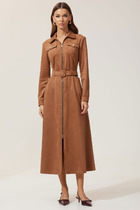 Платье А-образного силуэта, с неровной линией низа: с правой стороны длина платья до середины бедра, с левой стороны длина платья до щиколотки. По спинке платье со средним швом, в котором выполнен разрез от горловины до линии талии. По переду и спинке от горловины выполнены мягкие складки. В боковых швах обработаны карманы. По горловине обработана притачная планка, по которой выполнена застежка на навесные петли и пуговицы по спинке. Платье с английской проймой.