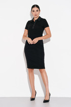 Платье полуприлегающего силуэта, выполненное на запах, длиной до середины бедра. Платье отрезное по линии талии. Лиф спинки со средним швом и рельефами. Лиф переда с рельефами от пройм до подреза по талии. Юбка спинки со средним швом и талиевыми вытачками. Юбка переда ассиметричная: правый перед укорочен, левый перед удлинен. Воротник пиджачного типа. Рукава двушовные, втачные, длинные. Застежка по переду на петли и пуговицы. Платье на подкладке с плечевыми накладками.