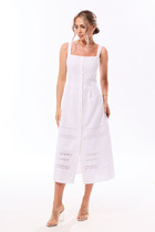 Платье женское расширенное книзу, длиной за колено, предназначено для повседневной носки. Перед с двумя нагрудными вытачками, с двумя прорезными карманами с листочками, с втачными концами на уровне линии бедер, со средним швом, вверху с разрезом, фиксирующимся пришивным украшением с двумя пробивными хольнитенами. Спинка со средним швом. Застежка на потайную тесьму-молнию в среднем шве спинки. Горловина круглая, обтачная, без воротника. Рукав втачной, двух шовный, длиной 3/4. Внизу верхнего рукава пата, фиксирующаяся в две настрочные шлевки. Пата с шестью пробивными хольнитенами. Платье с плечевыми накладками. Длина спинки 101 см. Длина рукава 46.5 см