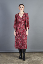 Платье женское отрезное по линии талии, длиной ниже колена, предназначено для повседневной носки. Верхняя часть переда с двумя нагрудными вытачками, с двумя односторонними зафиксированными складками справа, со средним швом с односторонней зафиксированной складкой, с цельнокроеной отлетной баской, с фигурным настрочным клапаном слева. Складка среднего шва декорируется 4-мя большими и 4-мя маленькими декоративными пуговицами. Нижняя часть переда с легкой сборкой по верхнему срезу. Верхняя часть спинки с двумя талиевыми вытачками, верхний срез нижней части спинки с легкой сборкой, расположенной между вытачками верхней части. В боковых швах платья обработаны карманы. Горловина круглая, обтачная, без воротника. Рукав втачной, короткий, одно шовный. Платье на хлопковой подкладке. Платье с плечевыми накладками. Длина спинки 115 см. Длина рукава 28 см