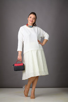 Платье женское полуприлегающего силуэта, длиной за колено, относится к нарядной торжественной одежде. Перед с двумя нагрудными вытачками. Спинка с двумя талиевыми вытачками. Горловина фигурная, обтачная, без воротника. Рукав втачной, короткий, одношовный. Рукав без оката, верхняя часть обтачная, крепится к плечевому шву на хлястик из отделочной ткани и 4 пришивных стразы. Платье двухслойное: верхний слой - кружевной, нижний- ткань костюмно-плательная. Длина спинки 107 см. Длина рукава 29 см
