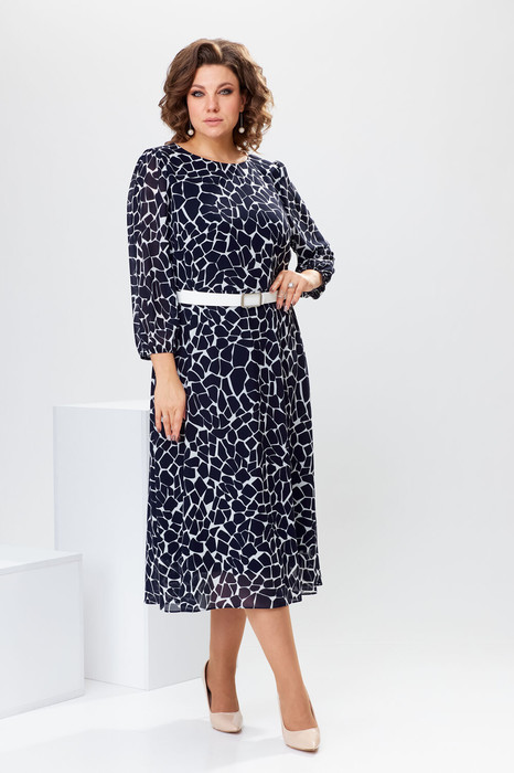 Платье женское отрезное по линии талии, расширенное к низу, длиной до середины икры. Верхняя часть переда с 2-мя нагрудными вытачками, нижняя цельнокроеная. Верхняя часть спинки с 2-мя таллиевыми вытачками, с обтачным разрезом по центру, фиксирующимся по горловине на 1-ну навесную петлю и 1-ну пришивную пуговицу; нижняя часть с 2-мя таллиевыми вытачками. Горловина круглая обточная, без воротника. Застёжка на потайную тесьму-молнию в левом боковом шве платья. Рукав втачной, одно шовный, по окату с лёгкой сборкой, длиной 7/8, низ собран на эластичную тесьму. Платье на подкладке. Платье без плечевых накладок. К платью прилагается отдельный ремень. Длина спинки платья 120 см, длина рукава 56 см.