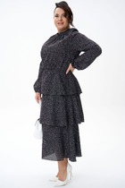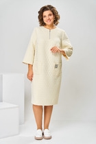 Платье женское, предназначено для повседневной носки. Платье женское отрезное по линии талии, слегка расширенное к низу, длиной до серединны икры. Верхняя часть переда с 2-мя нагрудными вытачками, с 2-мя вертикальными притачными планками, с 7-мью декоративными защипами шириной 0,3 см (с каждой стороны; нижняя часть переда с лёгкой сборкой по верхнему срезу по бокам). Верхняя часть спинки цельнокроеная; нижняя часть спинки с лёгкой сборкой по верхнему срезу. Платье с втачным поясом по линии талии с обработанной по ним кулисой с завязками с металлическими наконечниками. Горловина круглая с втачной стойкой. Застёжка центральная на верхней части переда на 5-ть вертикально обмётанных петель и 5-ть пришивных пуговиц. Рукав втачной, одно шовный длинный со сборкой и притачной манжетой, с застёжкой на обмётанную петлю и пришивную пуговицу. Платье на подкладке. Платье с плечевыми накладками. Длина спинки платья 126 см. Длина рукава 59 см.
