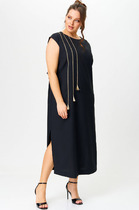 Платье женское относится к нарядной торжественной одежде. Платье женское прямого силуэта, длиной за колено. Перед с 2-мя нагрудными вытачками. Спинка с отрезной кокеткой с фигурным обтачным разрезом, фиксирующимся по горловине на 2-е обточные завязки. Горловина круглая, обтачная, без воротника. Рукав втачной, одношовный, длиной 3/4 с фигурным низом с 14-ю односторонними складками (по 7 с каждой стороны от угла манжеты), с притачной манжетой из отделочной ткани. Платье на подкладке. Платье без плечевых накладок.