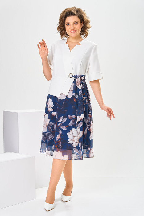 Платье женское относится к нарядной торжественной одежде, но может использовано и при повседневной носке. Платье женское, отрезное по линии талии, расширенное к низу, длиной за колено. Верхняя часть переда с отрезными рельефами, выходящими из плечевых швов, центральная часть с зафиксированным запахом. Верхняя часть спинки со средним швом и 2-мя рельефами, выходящими из плечевых швов. Горловина с V-образным вырезом, фигурная, обточная без воротника. Нижняя часть переда и нижняя часть спинки цельнокроеные, выполнены из отделочной ткани. Шов соединения верхней и нижней частей платья декорирован притачной фигурной отлетной баской. Платье с декоративным поясом из отделочной ткани, закреплённом на левом боковом шве и фиксирующимся в бант через металлическую пробивную блочку на центральной части переда. Рукав одно шовный втачной, длиной до локтя, с притачной фигурной манжетой. Платье с плечевыми накладками. Нижняя часть на подкладке. Длина платья 112 см, длина рукава 33 см.