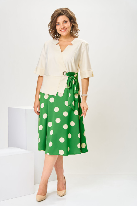 Платье женское относится к нарядной торжественной одежде, но может использовано и при повседневной носке. Платье женское, отрезное по линии талии, расширенное к низу, длиной за колено. Верхняя часть переда с отрезными рельефами, выходящими из плечевых швов, центральная часть с зафиксированным запахом. Верхняя часть спинки со средним швом и 2-мя рельефами, выходящими из плечевых швов. Горловина с V-образным вырезом, фигурная, обточная без воротника. Нижняя часть переда и нижняя часть спинки цельнокроеные, выполнены из отделочной ткани. Шов соединения верхней и нижней частей платья декорирован притачной фигурной отлетной баской. Платье с декоративным поясом из отделочной ткани, закреплённом на левом боковом шве и фиксирующимся в бант через металлическую пробивную блочку на центральной части переда. Рукав одно шовный втачной, длиной до локтя, с притачной фигурной манжетой. Платье с плечевыми накладками. Нижняя часть на подкладке. Длина платья 112 см, длина рукава 33 см.