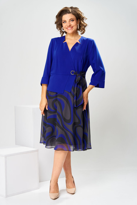 Платье женское относится к нарядной торжественной одежде, но может использовано и при повседневной носке. Платье женское, отрезное по линии талии, расширенное к низу, длиной за колено. Верхняя часть переда с отрезными рельефами, выходящими из плечевых швов, центральная часть с зафиксированным запахом. Верхняя часть спинки со средним швом и 2-мя рельефами, выходящими из плечевых швов. Горловина с V-образным вырезом, фигурная, обточная без воротника. Нижняя часть переда и нижняя часть спинки цельнокроеные, выполнены из отделочной ткани. Шов соединения верхней и нижней частей платья декорирован притачной фигурной отлетной баской. Платье с декоративным поясом из отделочной ткани, закреплённом на левом боковом шве и фиксирующимся в бант через металлическую пробивную блочку на центральной части переда. Рукав одно шовный втачной, длиной до локтя, с притачной фигурной манжетой. Платье с плечевыми накладками. Нижняя часть на подкладке. Длина платья 112 см, длина рукава 33 см.