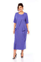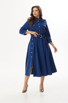 Платье женское, предназначено для повседневной носки. Платье женское, полу прилегающего силуэта, длиной за колено. Перед отрезной, ниже линии талии на 6 см; верхняя часть переда с 2-мя нагрудными выточками и средним швом, нижняя часть с отрезным бочком, шов соединения ею с передом, заканчивается шлицей, фиксирующейся на 3-и обмётанные петли и 3-и пришивные пуговицы; шов соединения часть переда декорирован 2-мя клапанами с закруглёнными концами закреплены на перед пришивными пуговицами. Спинка отрезная ниже линии талии на 6 см; верхняя часть с 2-мя таллиевыми вытачками и средним швом, нижняя часть с 2-мя таллиевыми выточками. Горловина с фигурным вырезом, обтачная без воротника. Платье со спущенным плечом. Рукам втачной, одно шовный, длиной за локоть. Платье без плечевых накладок. Длина спинки 105 см. Длина рукава+плечо 48 см.