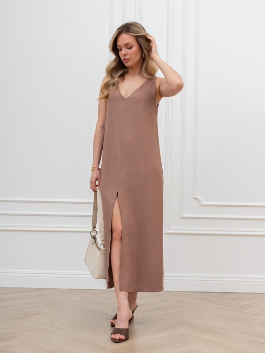 Платье женское из гладкокрашеного тканого полотна, свободное, слегка расширенное к низу, с глубоким V-образным вырезом горловины, обработанным внутренней обтачкой, без рукавов, с вытачками в области груди. Перед состоит из двух частей, в шве соединения деталей по центру длинный разрез.