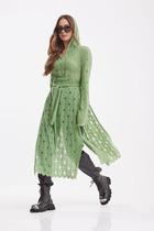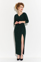 Платье женское свободного силуэта, с втачным рукавом. Перед с нагрудными выточками. Спинка с застежкой на молнию в среднем шве. Горловина круглой формы, декорирована отложным воротником. Изюминка платья – волнообразные рукава с разрезом, по низу на притачной манжете, с застежкой на петли и пуговицы.