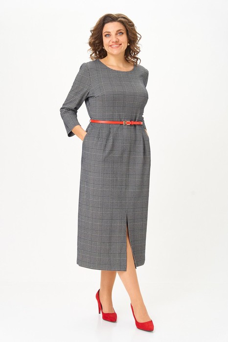 Платье женское полуприлегающего силуэта с втачным рукавом. Перед платья с горизонтальным эластичным швом по талии. Верхняя часть с вытачками по линии груди, нижняя часть со складками в области талии и карманами что обеспечивает прекрасную посадку и подчеркивает фигуру. Рукав длиной 7/8. Высокие разрезы по бокам и переду платья добавляют удобства. В комплекте съемный ремень.