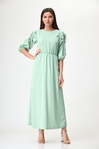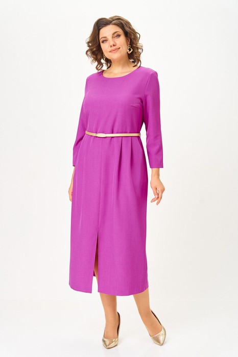 Платье женское полуприлегающего силуэта с втачным рукавом. Перед платья с горизонтальным швом по талии. Верхняя часть с вытачками по линии груди, нижняя часть со складками в области талии и карманами что обеспечивает прекрасную посадку и подчеркивает фигуру. Разрез по переду платья добавляет нотку игривости и удобства. В комплекте съемный ремень.