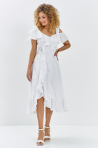 Платье женское свободного А-силуэта выполнено на подкладке из трикотажной ткани, с втачным рукавом. Горловина округлой формы. Верхняя часть платья отлетная, что придает изысканность платью. По переду расположены нагрудные вытачки, по спинке застежка на петлю и пуговицу в форме капельки, обеспечивающей идеальную посадку. Особенный акцент платья – это три ряда воланов по низу, добавляющие объем и изюминку. Нижний край воланов и рукавов не обработан.