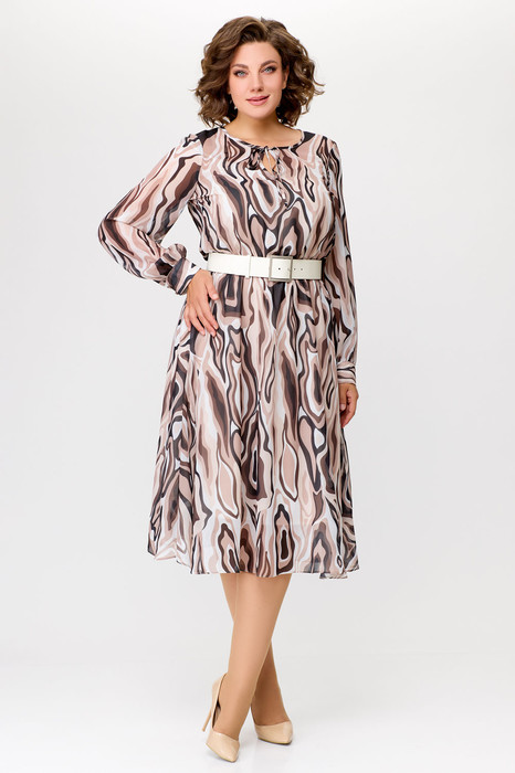 Платье Х-силуэта длиной миди, выполнено из шифона на трикотажной подкладке. Лиф отрезной по линии талии. Перед и спинка лифа цельнокроеные. Нижняя часть платья клешеная. Талия регулируется резинкой. Подкладка верхней части платья на бретелях. Рукав длинный втачной. По низу рукава сборка и притачная манжета, застёгивающаяся на 2 петли и пуговицы. Горловина округлой формы, по центру переда капелька с завязкой.