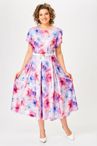 Платье из текстиля  прилегающего силуэта. Платье отрезное по линии талии. По переду и спинке лифа расположены рельефы. Юбка расклешенная из шести клиньев со встречными складками по линии талии. В среднем шве спинки предусмотрена молния. Рукав втачной покроя тюльпан, длина рукава 15 см. В комплекте ремень с декоративной пряжкой.