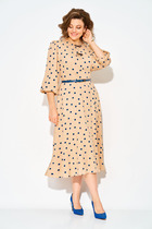 Платье женское, полуприлегающего силуэта с коротким рукавом. Рукав типа "фонарик" со сборкой сверху и снизу. По низу притачная манжета. По переду нагрудные вытачки. Горловина круглой формы. По низу ассиметричная, отлетная планка с разрезом и декоративная нашивка. По спинке средний шов с разрезом снизу и талевые вытачки. Горизонтальный подрез выше линии талии. Верхняя часть спинки и рукав выполнены из ткани сетка с флоковым нанесением. Застежка на потайную "молнию"