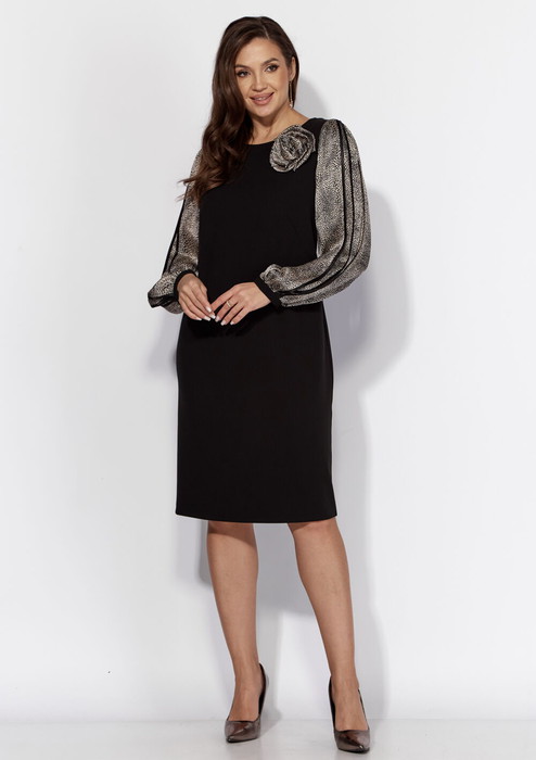 Платье женское, полуприлегающего силуэта с длинным втачным рукавом. Низ рукава присобран на манжету. По центру рукава вертикальные подрезы, оформленные контрастной окантовкой. По переду наклонные нагрудные вытачки. Вырез горловины круглой формы. Декором служит съемная брошь-цветок. По спинке средний шов с застежкой на потайную тесьму "молния" и разрезом по низу.