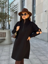 Платье женское, прямого силуэта, зауженное к низу. Рукав цельнокройный, длинной 7/8 с вставкой из принтованной сетки. По низу рукава фигурный волан с отделочной деталью и декором. Вырез горловины круглой формы. Вдоль горловины по переду и спинке декоративные вытачки. По спинке средний шов с разрезом снизу.