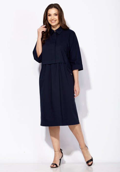 Платье женское, прямого силуэта с цельнокройным рукавом, длинной 3/4. По низу рукава манжет. По переду фигурные рельефы от плеча с карманами в них. Центральная часть отрезная по талии, с отлетной планкой и небольшой сборкой из по нее. Воротник рубашечный, на стойке. Застежка потайная, на пуговицы, до талии. По спинке фигурные рельефы от плеча. Центральная часть акцентирована настроченой деталью с декором. По бокам маленькие разрезы, закругленные со спинки.