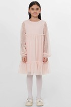 Платье из легкой хлопковой ткани двух расцветок, отрезное по талии. Нижняя часть в сборку, с рюшей по низу из ткани контрастного цвета. Рукав цельнокроеный, спущенный, с небольшими крылышками из ткани в цвет рюш. Горловина отделана узкой обтачкой из эластичной ткани. Полочка украшена шелкографией. Ткань гипоаллергенна, хорошо пропускает воздух.