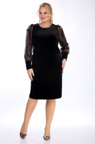 Однотонное универсальное платье, подойдет как для повседневной носки, так и для торжественных мероприятий. Перед со средним швом, нагрудными вытачками, фигурными кокетками. Спинка со средним швом, вытачками и разрезом для удобства ходьбы. Рукав втачной, одношовный. Декором служит элегантная съёмная брошь. Длина платья от центра горловины спинки до низа для р. 54,56,58 - около 103,5-104 см, для р. 60,62,64 - около 105,5-106 см. Материал тянется.