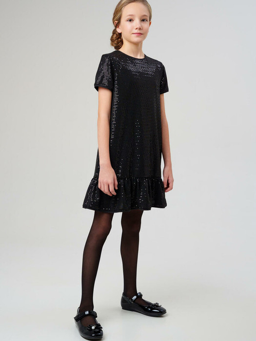 Модное чёрное платье для девочки от PlayToday — стильная модель для праздников и особых случаев. Платье выполнено из мягкого трикотажа с мерцающими пайетками, которые создают эффектное сияние при движении. Укороченный рукав и волан по низу добавляют лёгкости и женственности силуэту.