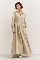 Платье прямое с поясом. По переду рельефы. В среднем шве спинки молния, в низу разрез. Рукав реглан с воланом. Длина изделия 108 см.