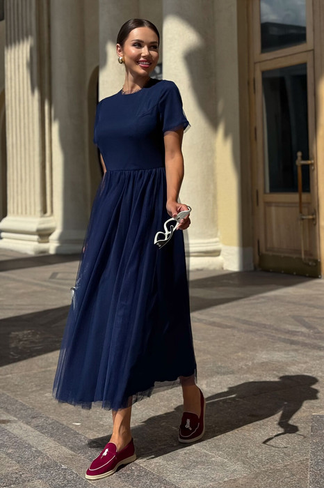 Нарядное вечернее платье из фатина — это идеальный выбор для женщин, которые ищут элегантный образ для торжества, свадьбы, юбилея или праздничного мероприятия. Платье женское, полуприлегающего силуэта, отрезное по линии талии, двухслойное, выполнено из плательной ткани в сочетании с сеткой. Верхний слой из отделочной ткани - сетка, нижний слой из плательной ткани.