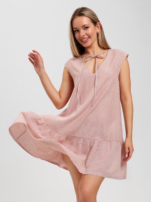 Платье молодежное, свободного покроя, с V- образным вырезом горловины, без рукавов. Горловина и проймы окантованы основным материалом, низ изделия с притачной оборкой. Акцентной деталью платья являются узкие завязки, вставленные в горловину с изнаночной стороны, завязывающиеся на бант спереди, которые при желании изменить внешний вид изделия, могут быть убраны вовнутрь.