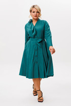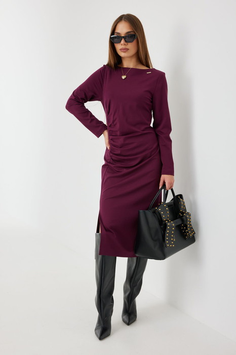Платье женское из приятной трикотажной ткани на подкладке. Рукав длинный, одношовный. По спинке средний шов и талевые вытачки, что создает приталенный силуэт.  Драпировка и сборка на животе корректирует фигуру подчеркивая женственность. Разрез по ноге добавляет игривости, делая образ более динамичным.