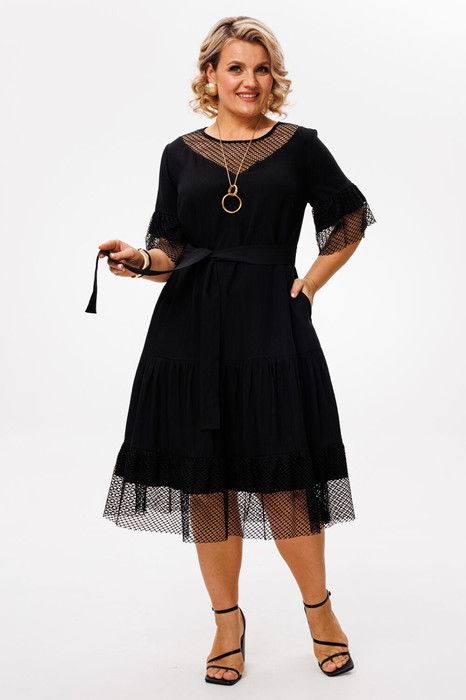 Платье женское А-образного силуэта с естественной линией плеча. Рукав втачной длиной за линию локтя с оборкой по низу. Горловина округлой формы. Перед с нагрудной вытачкой и кокеткой из сетки. По низу переда и спинки обработаны последовательно две оборки, нижняя оборка из сетки. Застежка на тесьму-молнию в среднем шве спинки. В боковых швах обработаны карманы. В комплект входит съемная подвеска и пояс.