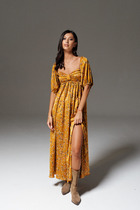 Платье полуприлегающего силуэта с естественной линией плеча с лёгким заужением по низу. Спинка со средним швом, талиевыми вытачками и застежкой на молнию. Перед с нагрудными и талиевыми вытачками. По переду обработана отделочная отрезная планка из полотна с пайетками. Для комфорта и практичности носки в шве притачивания планки переда обработана шлица. Вырез горловины V-образной формы. Рукав втачной одношовный длинный, выполнен из эластичной сетки. Низ рукава обработан манжетой из полотна с пайетками.