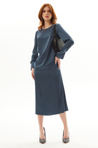Платье прямого силуэта с естественной линией плеча. Спинка со средним швом и застежкой на молнию. В среднем шве спинки выполнена шлица. Перед с нагрудными вытачками. Вырез горловины округлой формы. Рукав втачной одношовный длиной 5/8. Низ рукава обработан манжетой и ткани с пайетками. В боковых швах обработаны карманы.