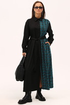 Платье женское А-образного силуэта со спущенной линией плеча. Рукав типа "летучая мышь".Горловина округлой формы. В среднем шве спинки застежка на тесьму-молнию. По переду выполнен ряд ассиметричных подрезов с кантами контрастного цвета и легкая сборка. В боковых швах обработаны карманы. Горловина, низ рукава и платья окантованы тканью контрастного цвета.