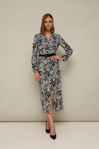 Платье женское А-образного силуэта со спущенной линией плеча. Рукав типа "летучая мышь". Горловина округлой формы. В среднем шве спинки застежка на тесьму-молнию. По переду выполнен ряд ассиметричных подрезов с кантами контрастного цвета и легкая сборка. В боковых швах обработаны карманы. Горловина, низ рукава и платья окантованы тканью контрастного цвета.