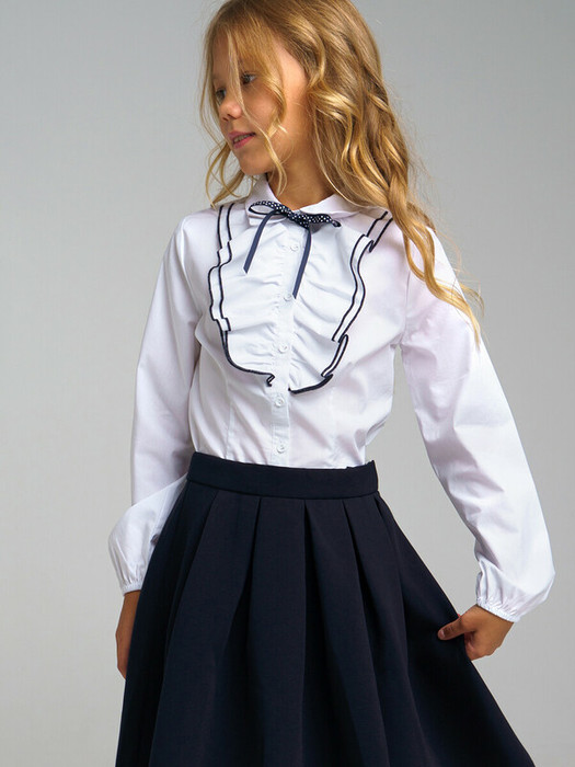 Белая нарядная текстильная блузка полуприлегающего силуэта, приталенная для девочки подростка. Школьная блузка на пуговицах хорошо держит форму, комфортна в носке и проста в уходе. Высокое содержание хлопка. Рубашка в школу с длинным рукавом и декоративной рюшей разнообразит повседневные школьные образы.