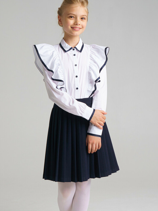 Белая нарядная текстильная блузка прямого силуэта, приталенная для девочки подростка. Школьная блузка на пуговицах, ткань с высоким содержанием хлопка хорошо держит форму, комфортна в носке и проста в уходе. Рубашка в школу с длинным рукавом и рюшами разнообразит повседневные школьные образы.