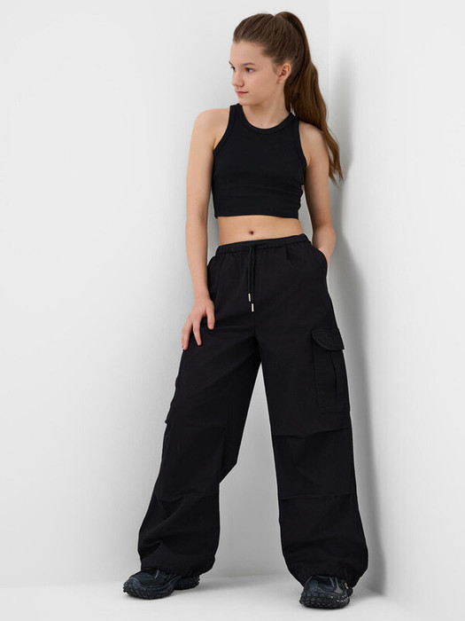 Брюки карго для девочки подростка. Выполнены из плотного хлопкового твилла. Модель имеет заниженную посадку и свободный крой с утяжками внизу, которые позволяют регулировать ширину брючин. Пояс на резинке с дополнительной регулировкой шнуром. На бедрах расположены накладные карманы на липучке, а также боковые карманы.