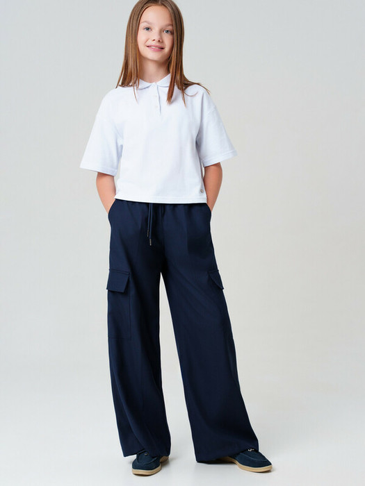 Идеальные брюки для школы, сочетающие комфорт и аккуратный внешний вид. Модель с посадкой Wide leg — это широкие брюки с расслабленной посадкой, максимальной длиной и акцентом на талии. Обеспечивает свободу движений, а резинка со шнурком позволяет легко регулировать посадку по фигуре.