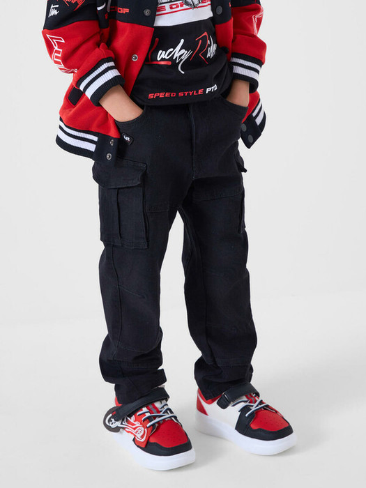 Детские джинсы карго для мальчика. Модель с прямым кроем и средней посадкой, выполненные из плотного денима. В дизайне предусмотрено много карманов: боковые, большие накладные-карго и два на задней части. Основная застёжка — болт и молния, в поясе встроена резинка, а также есть шлёвки под ремень. Карманы на бедрах закрываются на скрытые магнитные кнопки. Спереди есть декоративный шеврон, сзади — текстильная нашивка на поясе.
