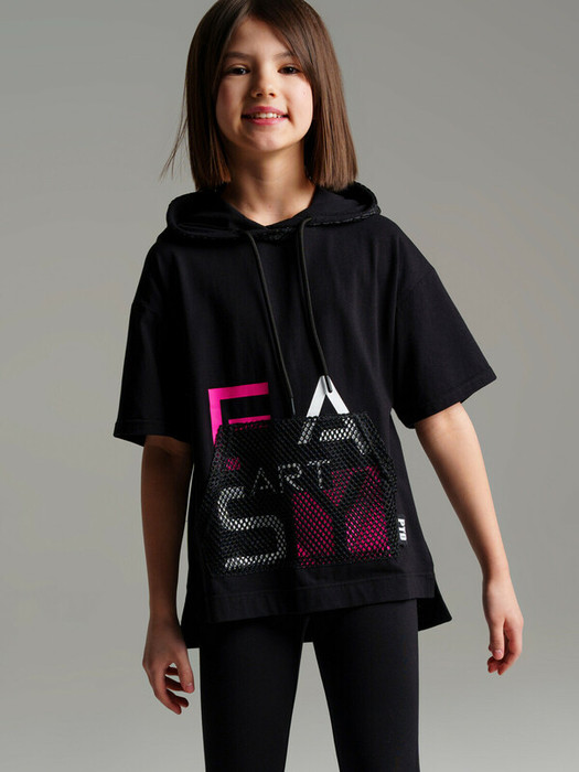 Футболка с капюшоном oversize из качественного и приятного на ощупь трикотажа джерси. Высокое содержание хлопка 95%. Благодаря наличию эластана в составе ткани изделие проще в уходе и держит форму. Капюшон с утяжкой шнурком. Карман из сетки.