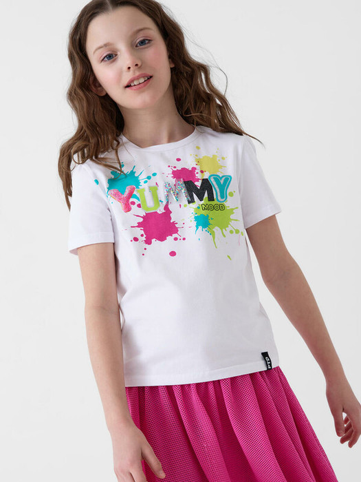 Футболка оверсайз для девочки подростка. Модель выполнена из эластичного хлопкового трикотажа джерси. На груди расположен крупный красочный принт. Горловина круглая. В нижней части — небольшая нашивка.
