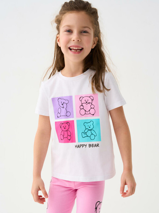 Детская футболка для девочки. Модель прямого кроя, выполнена из эластичного хлопкового трикотажа джерси. Красочный принт с милыми мишками. Горловина круглая.